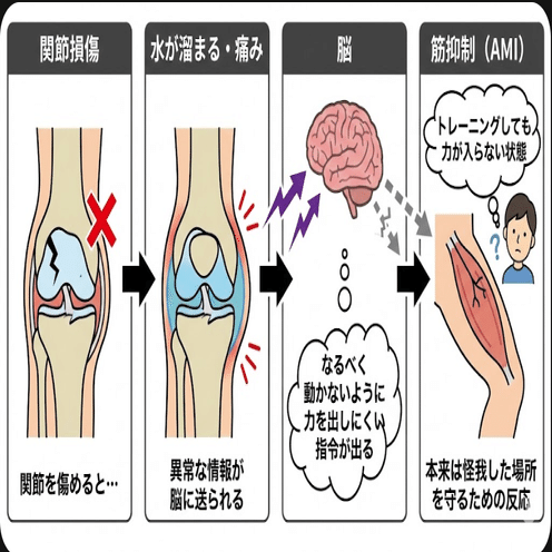 • AMI(関節原性筋抑制):関節を傷めると、神経の伝達が悪くなり、筋肉に力が出なくなる状態